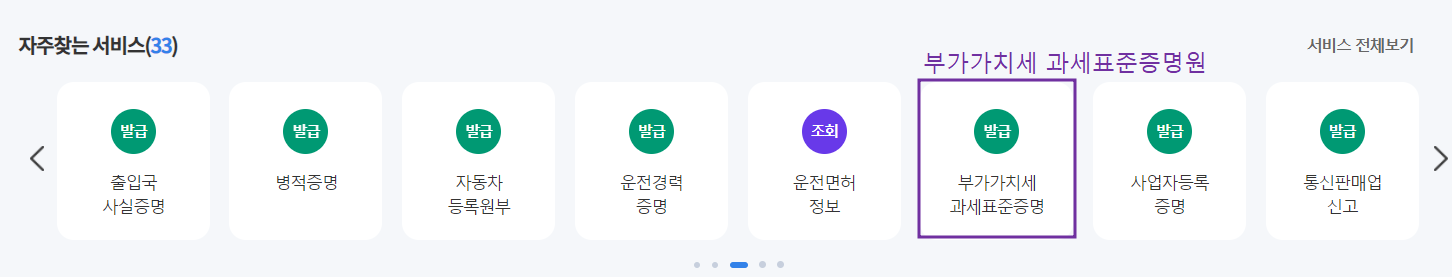 첫 화면의 자주찾는 서비스에 주로 찾으시는 납세증명서들이 모두 있습니다.